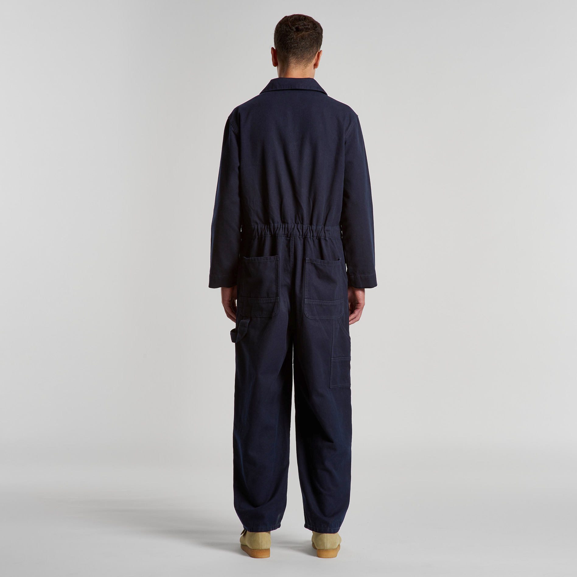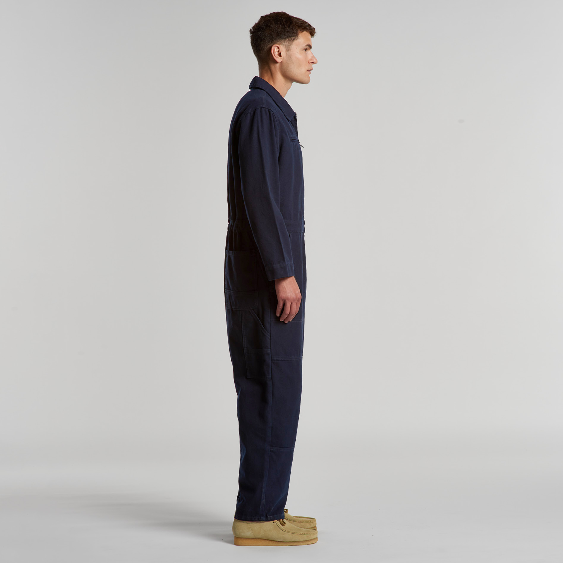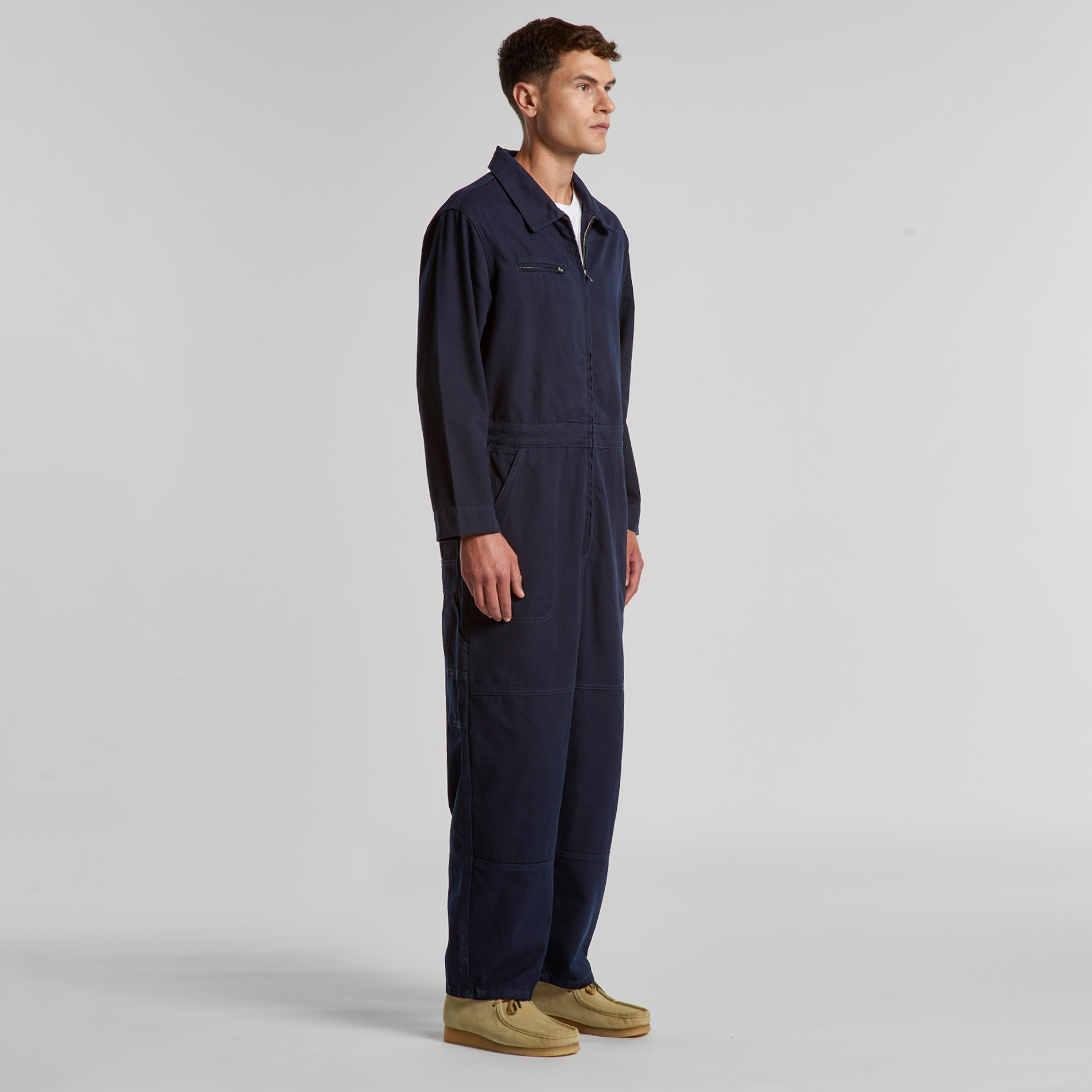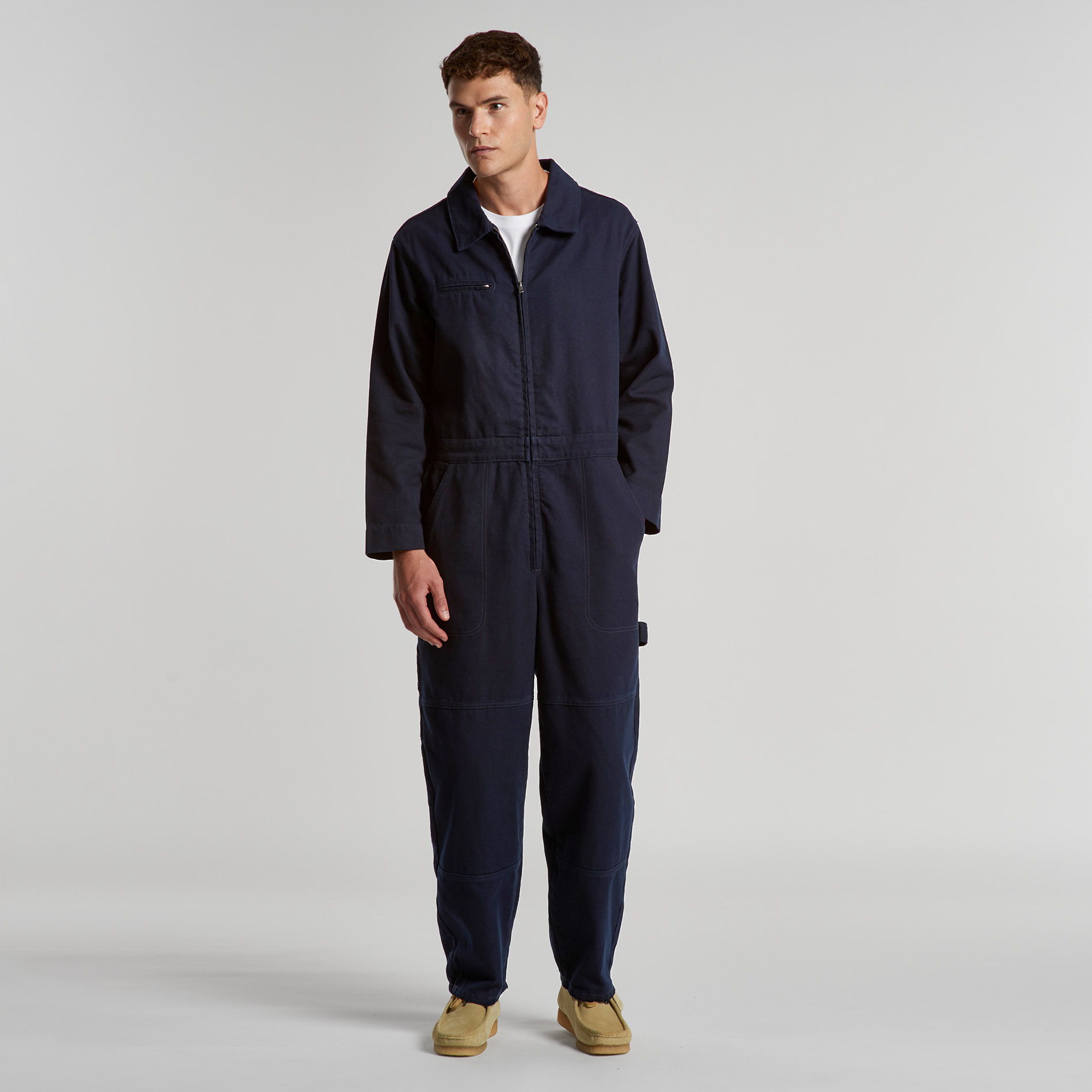 100% Cotton Duck canvas, Collared all-in-one, adjustable shoulder straps, YKK zip front, 6 pockets, top stitch detailing, Elastic at center back, hammer loop, zip close chest pocket, internal access at pocket, double patch knees