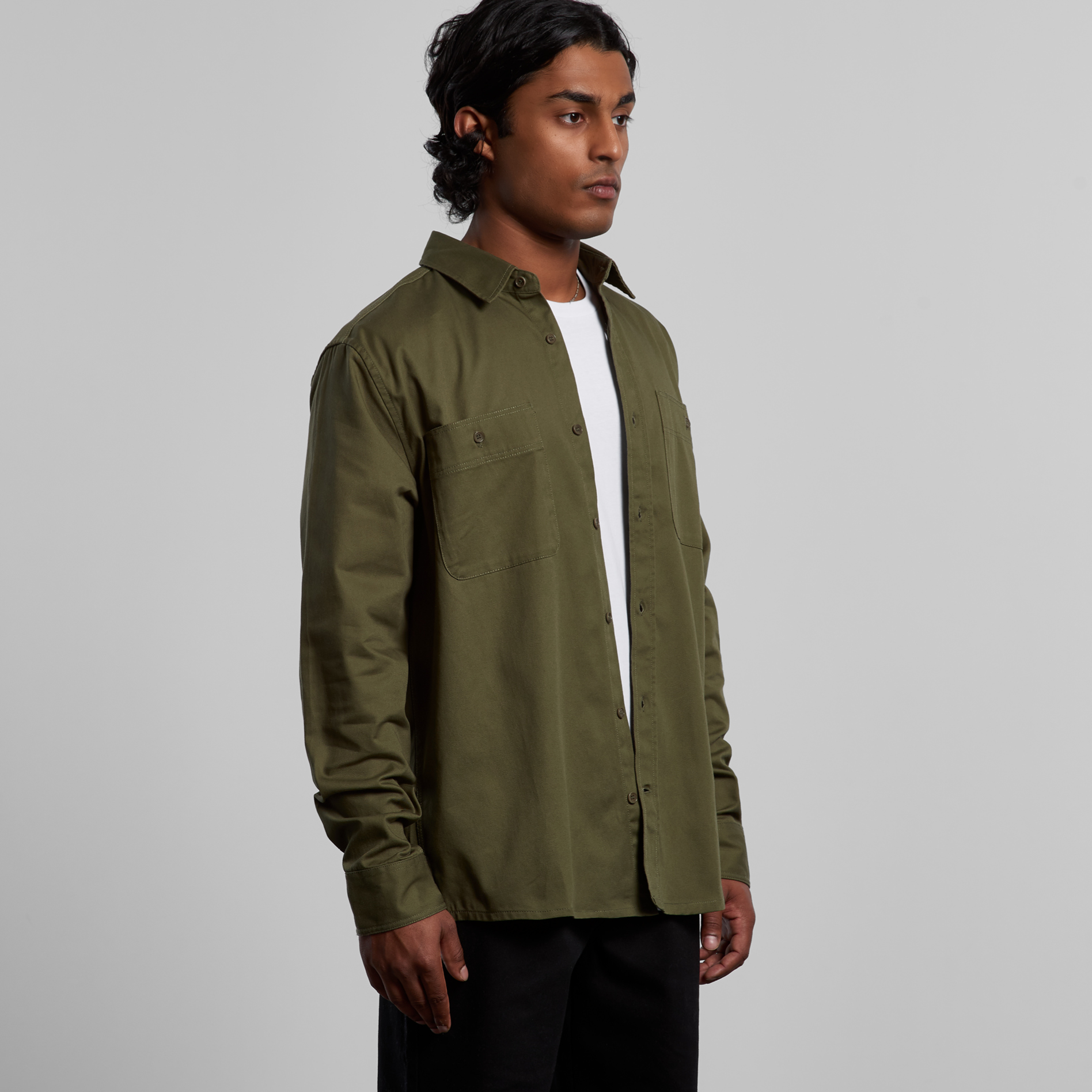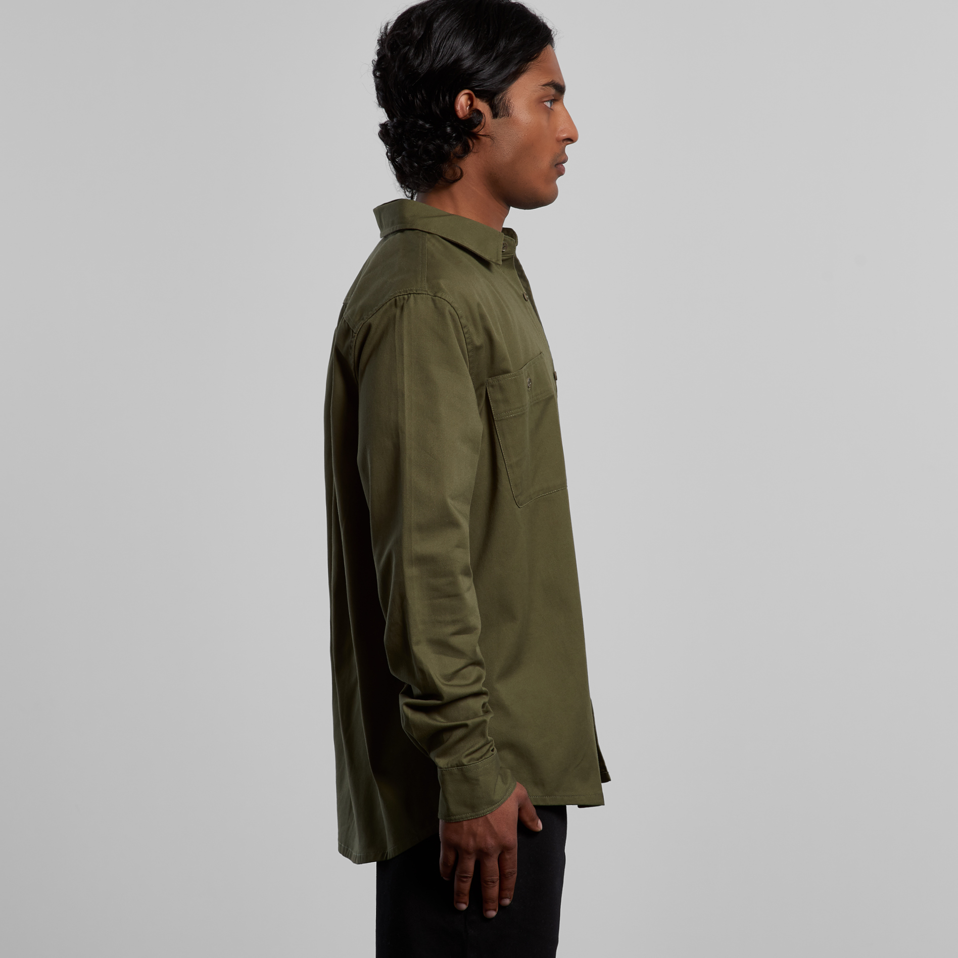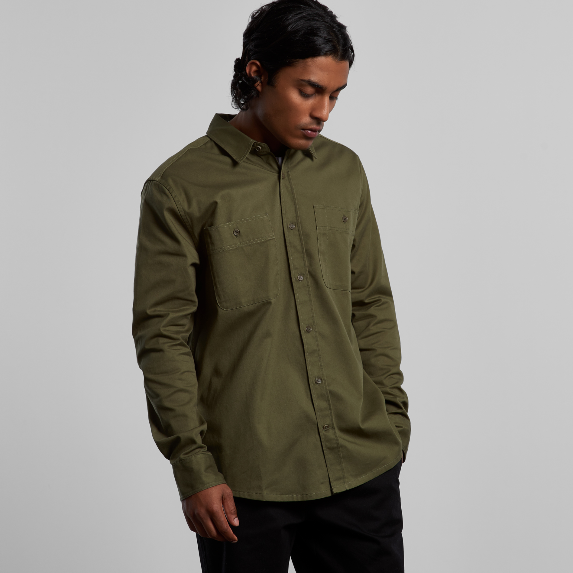 Long sleeve button up shirt, two chest pockets with pen channel, tonal buttons, side seamed, back yoke with hang loop, preshrunk to minimise shrinkage